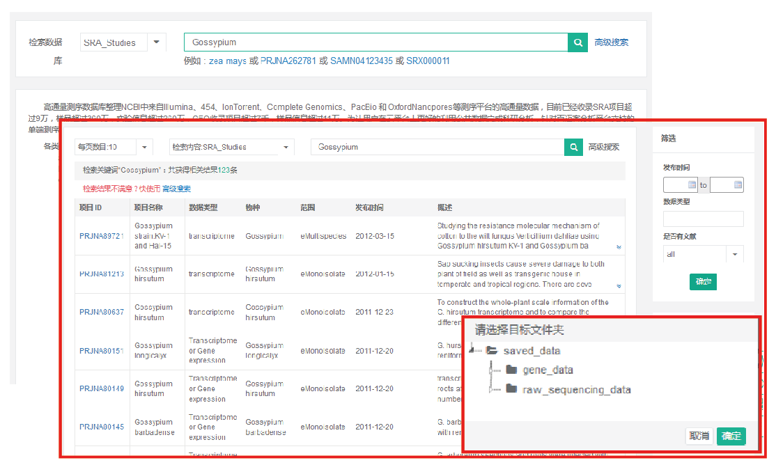 2)搜集SRA數(shù)據(jù)庫中,棉屬轉(zhuǎn)錄組數(shù)據(jù),共搜集得到154個來源于illumina平臺的棉屬轉(zhuǎn)錄組數(shù)據(jù)。BMKCloud公共數(shù)據(jù)模塊數(shù)據(jù)搜集過程:進(jìn)入平臺公共數(shù)據(jù)模塊,輸入關(guān)鍵詞“Gossypium”,并按SRA項目編號進(jìn)行檢索,使用數(shù)據(jù)類型“transcriptome”進(jìn)行過濾,最終得到104個項目數(shù)據(jù),可根據(jù)數(shù)據(jù)來源平臺在進(jìn)行進(jìn)一步手動過濾,最后一鍵保存數(shù)據(jù)至用戶賬號用于后續(xù)分析