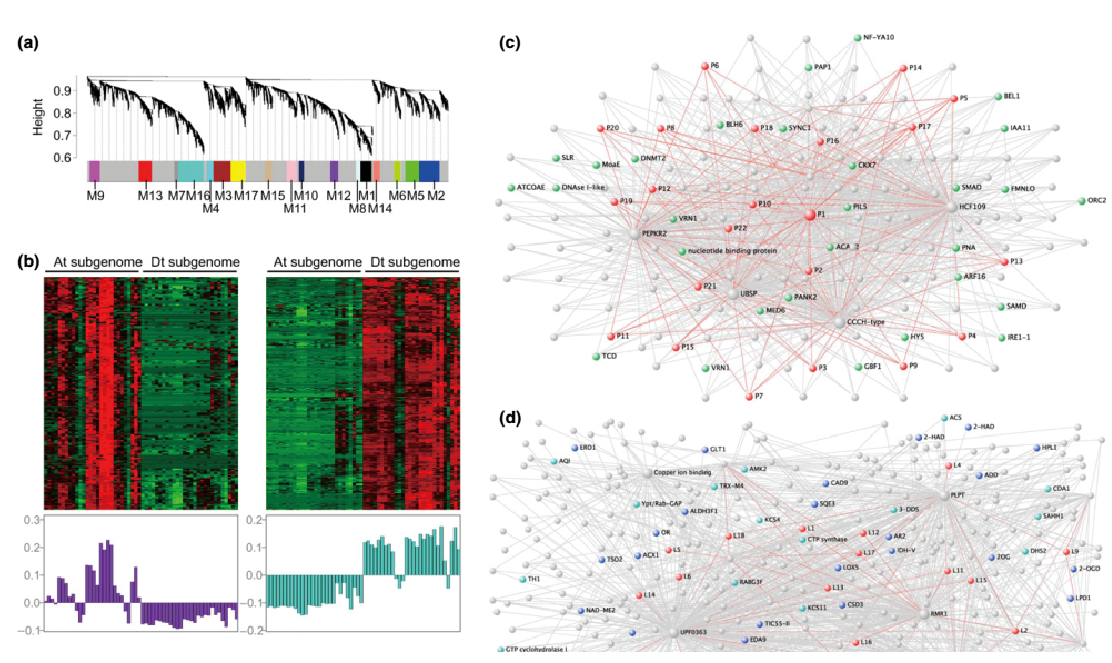 2)WGCNA分析共將上述基因劃分為17個模塊,其中模塊16與模塊12分別表現(xiàn)為D亞基因組、A亞基因組偏倚表達(dá),模塊16也在oxidation -reduction生物途徑上有顯著 富集,這一途徑一般認(rèn)為與棉纖維的發(fā)育相關(guān)。