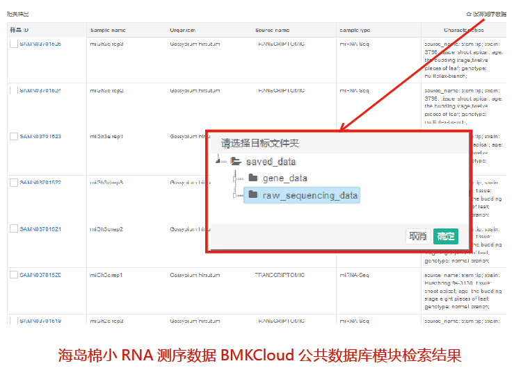 2)使用上述公共數(shù)據(jù)鑒定海島棉中的microRNA及各自的前體序列。該步驟可將在BMKCloud平臺目錄下保存的PRJNA284336項目數(shù)據(jù)直接導(dǎo)入BMKCloud 小RNA分析平臺 完成。