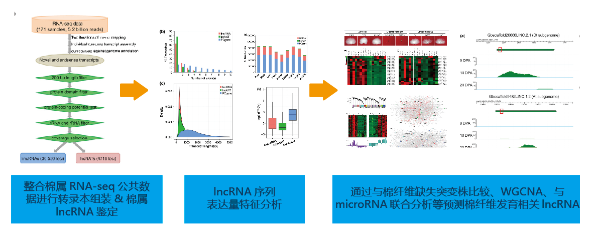整合公共數(shù)據(jù)庫中棉屬RNA-seq數(shù)據(jù),進(jìn)行轉(zhuǎn)錄本重構(gòu)(有參)并鑒定其中l(wèi)ncRNA,用于后續(xù)的棉纖維發(fā)育相關(guān)lncRNA分析
