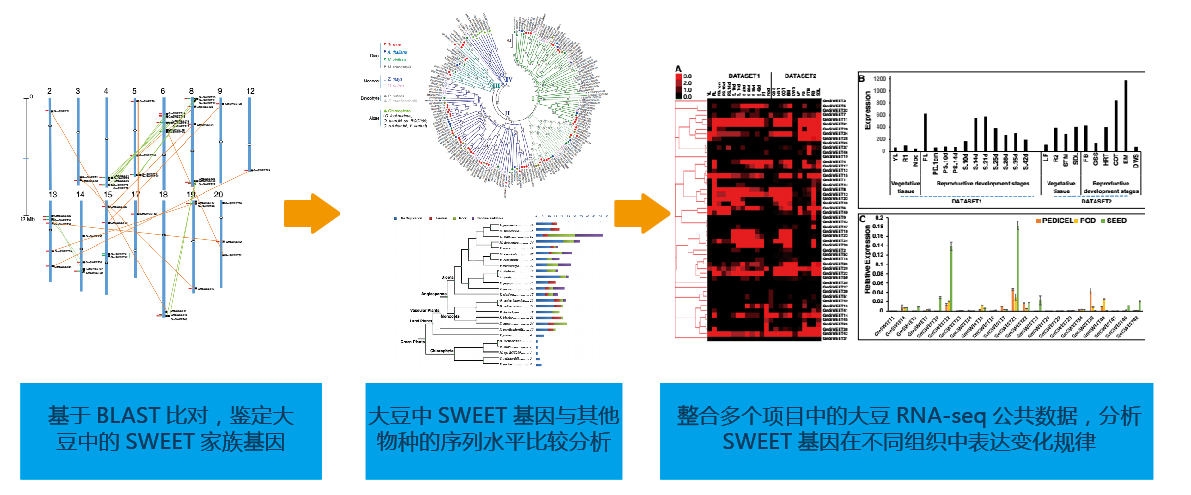 整個(gè)多個(gè)大豆RNA-seq公共數(shù)據(jù),分析SWEET基因家族在大豆生殖組織與營(yíng)養(yǎng)組織間表達(dá)變化規(guī)律