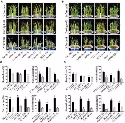 分別取XL22、CA1-OE、SAPK6-OE、KY-131-N的4葉齡種子材料,每個(gè)3個(gè)生物學(xué)重復(fù),均進(jìn)行42℃ 12小時(shí),4℃5天處理,最后正常環(huán)境下生長7天,觀察這各材料之間的葉卷曲清苦以及存活率,結(jié)果顯示,XL22表現(xiàn)為個(gè)更高的存活率(圖5C),更加輕微的葉片卷曲(圖4A),表明XL22相較于單基因轉(zhuǎn)化株與非轉(zhuǎn)基因株擁有更強(qiáng)的耐熱、抗寒能力。