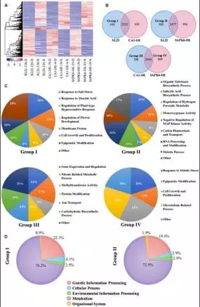 c)由于轉(zhuǎn)基因材料中過表達(dá)基因?yàn)閎ZIP家族轉(zhuǎn)錄因子及其活性激活基因家族,研究者重點(diǎn)關(guān)注了3個(gè)材料中轉(zhuǎn)錄上調(diào)的基因,這些基因被劃分為4類:Group1,XL22相較于CA1-OE特有上調(diào)基因,645個(gè);Group2,XL22相較于SAPK6-OE特有上調(diào)基因,500個(gè)基因特異上調(diào);Group3,CA1-OE相較于SAPK6-OE特有上調(diào)基因,398個(gè);Group4,SAPK6-OE相較于CA1-OE特有上調(diào)基因,869個(gè)。Group I主要分布在“Response to ABA”、“Regulation of Plant-type Hypersensitive response”等GO term;Group II主要分布在“Organic Substance Biosynthetic Process” 、“Salicylic Acid Biosynthetic Process” 、“Regulation of Hydrogen Peroxide Metabolic Process”等GO term;Group3主要分布在“Gene Expression and Regulation”、 “Nitrate Related Metabolic Process” 、 “Carbohydrate Biosynthetic Process” 等GO term;Group4主要分布在 “Cytokinesis and Cell Proliferation”、“Microtubule Related Process”、“Response to Abiotic Stress” 等GOterm(見圖6C)。因此推測,XL22中的兩個(gè)基因可能激活了不同的干旱脅迫應(yīng)答基因。
