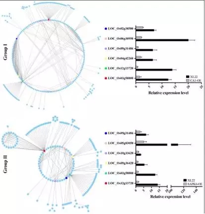 d)為了揭示GroupI 、Group2兩個(gè)基因集內(nèi)部的基因調(diào)控關(guān)系,研究者基于STRING數(shù)據(jù)庫分別繪制了上述兩個(gè)基因集內(nèi)部基因的蛋白互作網(wǎng)絡(luò)圖。如圖7所示,GroupI蛋白互作網(wǎng)絡(luò)中包含481個(gè)PPI(protein-protein intereaction,PPI),Group2中包含280個(gè)PPI。其中,有6個(gè)基因在蛋白互作網(wǎng)絡(luò)中均處于非常中心的位置(與之互作蛋白數(shù)量越多,越靠近中心位置)。其中,3個(gè)(LOC_Os12g13720, ?LOC_Os03g58800, ?LOC_Os09g31486) 在兩個(gè)蛋白互作網(wǎng)絡(luò)中均處于中心位置,分別編碼 PDR ABC transporter, a ATPase, and a DnaK/Hsp70s family protein,可能在干旱應(yīng)答過調(diào)控網(wǎng)絡(luò)發(fā)揮著非常關(guān)鍵的;其他3個(gè)基因(Group1特異:LOC_Os04g42260 ?LOC_Os02g38580,Group2特異:LOC_Os05g03050)分別編碼protein phosphatase、Rad51、Hsp90 ,從功能可以看出,它們與水稻干旱應(yīng)答同樣相關(guān)。