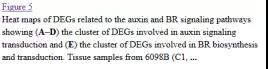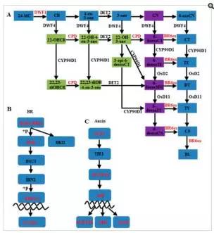 e)圖4展示了在BR生物合成、BR信號(hào)轉(zhuǎn)導(dǎo)通路、auxin信號(hào)轉(zhuǎn)導(dǎo)通路上鑒定到的差異表達(dá)基因。這些差異基因中,BR6OX調(diào)控了BR生物合成過程中multiple C-6C的氧化過程;DWRF1催化24-methylenecholesterol轉(zhuǎn)化為campesterol,該過程為BR生物合成的第一步;分布在BR信號(hào)轉(zhuǎn)導(dǎo)通路上的差異基因包括 BRI1, BSK, BZR1, and CYCD3等, 這些基因多在品系 Purler中下調(diào) (見圖 5E);分布在 auxin 信號(hào)轉(zhuǎn)導(dǎo)通路上的基因包括 AUX1, IAA, GH3, ARF等,其中 IAAs, GH3s, ?ARFs 在兩個(gè)時(shí)間點(diǎn)的 Purler品系材料中均表現(xiàn)為上調(diào)。