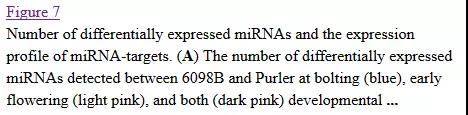 c) IDEG6軟件分析( |FC| >2)進(jìn)行差異表達(dá)分析,兩個(gè)時(shí)間點(diǎn)在兩個(gè)品系間分別檢測得到45、65個(gè)差異表達(dá)microRNA。值得注意的是,如圖7所示,除了miR1140 與miR827, 抽薹時(shí)間點(diǎn)上的所有已知 差異表達(dá)miRNAs 均在 品系Purler中上調(diào),這其中包括3個(gè)miR156 家族 與6個(gè) miR395 家族microRNA,相反,花發(fā)育早期時(shí)間點(diǎn)上的所有差異表達(dá)miRNAs 均在 品系Purler中下調(diào)。