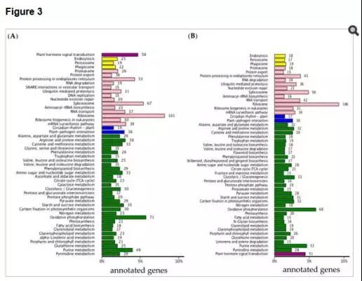 d)對兩個(gè)時(shí)間點(diǎn)所有差異基因進(jìn)行KEGG通路分析,其中3297個(gè)基因注釋到了KEGG數(shù)據(jù)庫 ,其中大多數(shù)基因注釋到了 ribosome 、oxidative phosphorylation相關(guān)代謝通路。值得注意的是,在兩個(gè)時(shí)間點(diǎn)分別有58、51個(gè)差異基因注釋到了植物激素信號(hào)通路,進(jìn)一步分析發(fā)現(xiàn),這些通路大多為BR或auxin信號(hào)轉(zhuǎn)導(dǎo)通路。該部分結(jié)果如圖3所示。
