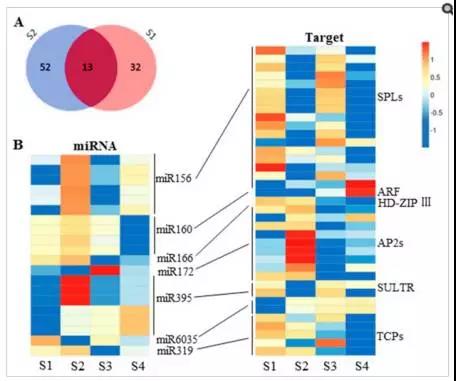 大部分的miRNA與其對應(yīng)的靶基因在表達(dá)量上均呈負(fù)相關(guān),比如, miR156 在Purler品系中轉(zhuǎn)錄上調(diào), 其對應(yīng)的大部分的 靶向 SPL 基因在Purler品系中表現(xiàn)為下調(diào); ?miR395 與miR319 在Purler品系中轉(zhuǎn)錄上調(diào) ,其對應(yīng)的靶基因包括 Sulfate Transporter (SULT) 、TEOSINTE-BRANCHED/CYCLOIDEA/PCF (TCP)表現(xiàn)為相反的趨勢,這些結(jié)果說明,本研究中的mRNA-seq、microRNA-seq結(jié)果均比較可靠。轉(zhuǎn)錄水平表現(xiàn)為相反趨勢的的miRNA-gene 可用于后期進(jìn)一步更加深入的挖掘油菜分枝背后的microRNA-mRNA調(diào)控網(wǎng)絡(luò)。