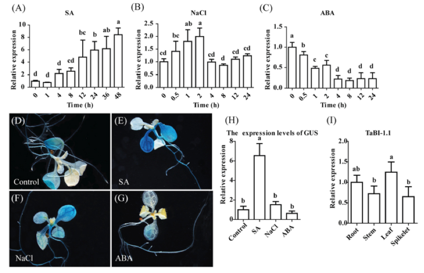 研究者創(chuàng)建了含有1.7kb TaBI-1.1啟動子并生成轉(zhuǎn)基因擬南芥的PBI :: GUS融合構(gòu)建體,以研究TaBI-1.1的空間表達(dá)模式。使用GUS染色測定組織GUS活性。在成熟葉和根中有TaBI-1.1表達(dá),但在下胚軸和幼葉中觀察不到(圖1D)。還檢測了各種小麥組織中的TaBI-1.1表達(dá)水平,包括根,莖,葉和小穗,結(jié)果表明TaBI-1.1的表達(dá)在這些小麥組織中普遍存在,而且在葉中最高,在小穗中最低(圖1I)。在SA和NaCl處理之后,成熟葉中的表達(dá)與對照相比增加,并且SA處理的表達(dá)更高。當(dāng)SA和NaCl處理時,在下胚軸中也檢測到表達(dá)(圖1E,F(xiàn))。在ABA處理的植物的葉子中檢測到較弱的表達(dá)(圖1G)。通過qRT-PCR進(jìn)一步證實GUS表達(dá)水平(圖1H)。以上結(jié)果表明,TaBI-1.1在各種脅迫下均有表達(dá)。