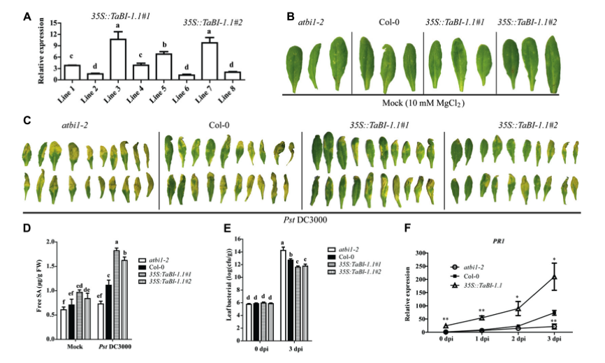 圖2. TaBI-1.1轉(zhuǎn)基因擬南芥對Pst DC3000的抗性增強(qiáng)