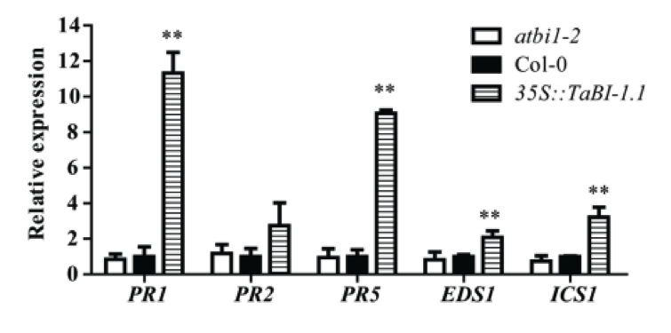 圖3. 通過qRT-PCR檢測正常條件下生長的atbi1-2,Col-0和35S :: TaB1-1.1 2周齡幼苗中5個SA相關(guān)基因的表達(dá)水平。