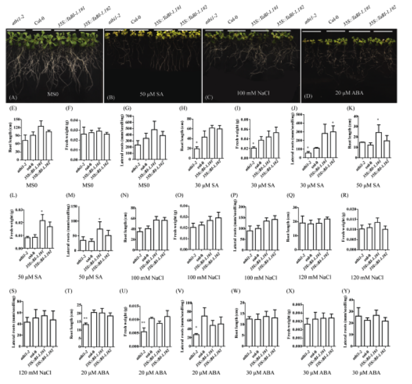 圖4. 在含有SA,NaCl或ABA的MS培養(yǎng)基上生長的atbi1-2,Col-0和35S :: TaB-1.1幼苗根長,鮮重和側(cè)根數(shù)的統(tǒng)計分析。