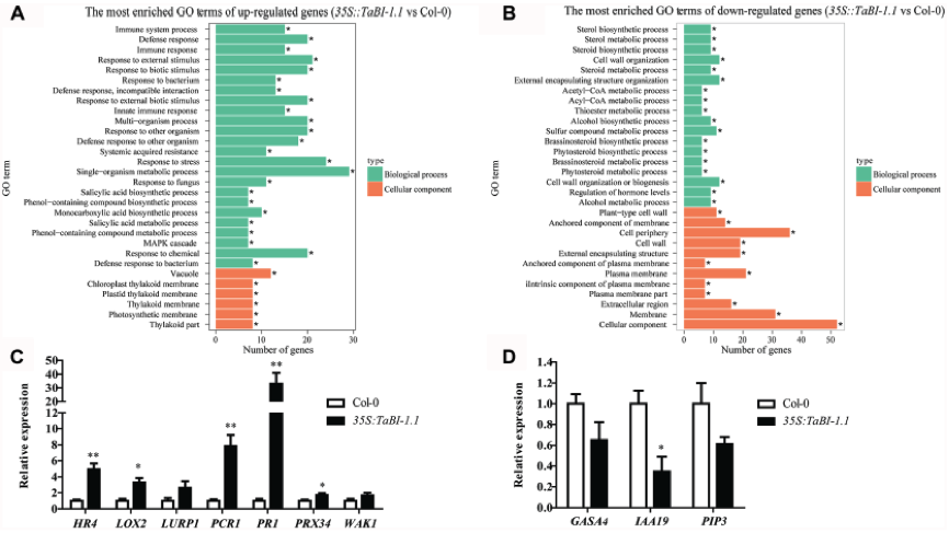 研究人員對35S :: TaBI-1.1#1和Col-0植物進(jìn)行了RNA-seq分析,以更好地理解TaBI-1.1功能。鑒定出48個上調(diào)基因和58個下調(diào)基因并做了一個熱圖。使用GO分析將差異表達(dá)的基因功能分類。富集了30多個GO terms,如圖6所示。對于上調(diào)的基因,富集的GO terms主要集中在抗生物脅迫,細(xì)胞免疫應(yīng)答和SA合成與代謝相關(guān)的生物過程上。前10個關(guān)鍵的Go terms分別是防御反應(yīng)、對外部刺激的反應(yīng)、對生物刺激的反應(yīng)、對外部生物刺激的反應(yīng)、多生物體過程、對另一個生物體的反應(yīng)、對另一個生物體的防御反應(yīng)、對壓力的反應(yīng)、單一生物體代謝過程和對化學(xué)物質(zhì)的反應(yīng)(圖6A)。對于下調(diào)的基因,富集的GO terms集中在細(xì)胞組分上,并且前三項是細(xì)胞組分,膜和細(xì)胞周圍(圖6B)。選擇七個上調(diào)基因和三個下調(diào)基因進(jìn)行qRT-PCR實驗,結(jié)果表明,qRT-PCR結(jié)果與RNA-seq分析一致。