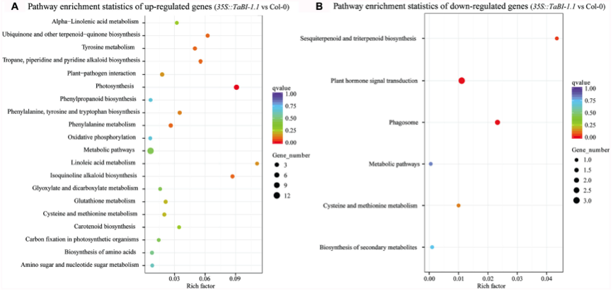 KEGG富集分析差異表達(dá)基因被呈現(xiàn)為散點(diǎn)圖。 使用富集因子、q值和通路中富集的基因數(shù)量來測量富集程度。 富集因子越高表示富集程度越高。觀察到上調(diào)基因富集了20多個KEGG通路。上調(diào)基因的前20個富集通路中,其中光合作用是最明顯的富集途徑(圖7A)。 光合作用的富集因子達(dá)到0.09,而q值大約為0。相反,下調(diào)基因的KEGG富集通路并不明顯,只有6個富集因子較低的通路被鑒定出來(圖7B)。因此,TaBI-1.1參與對生物脅迫的應(yīng)答并主要通過基因上調(diào)表達(dá)來執(zhí)行其防御功能。