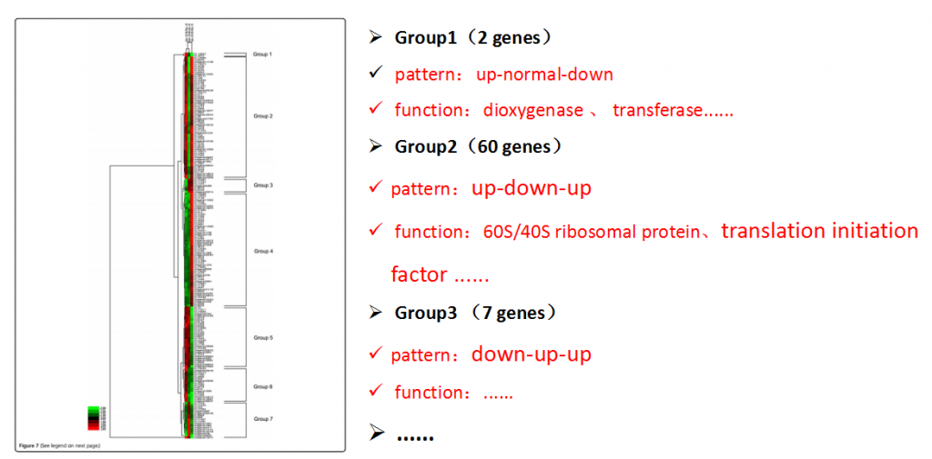 圖片與列表交互功能可實(shí)現(xiàn)對(duì)聚類熱圖中各個(gè)聚類模塊內(nèi)基因ID及其表達(dá)量信息的提取,利用該交互功能得到的信息,結(jié)合云平臺(tái)上表達(dá)模式分析工具、基因功能分析工具及文件操作工具,可深入挖掘聚類熱圖上不同聚類模塊內(nèi)基因集合的表達(dá)模式與功能信息。