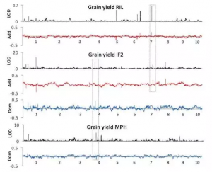永久F2群體中,F(xiàn)1個(gè)體的中親值是根據(jù)F1個(gè)體本身的表現(xiàn)與雙親性狀值計(jì)算出來(lái)的。中親值=F1表型值-親本中親值。計(jì)算每個(gè)F1對(duì)應(yīng)的中親值,以中親值為表型進(jìn)行QTL定位,其QTL的效應(yīng)是雜合子與雙親表現(xiàn)均值的差異。由于雜種優(yōu)勢(shì)QTL的特殊性,分別利用F2群體類(lèi)型和RIL群體類(lèi)型分別定位顯性QTL。所用軟件同上,在檢測(cè)顯性效應(yīng)時(shí)同樣也檢測(cè)顯性和顯性互作QTL。