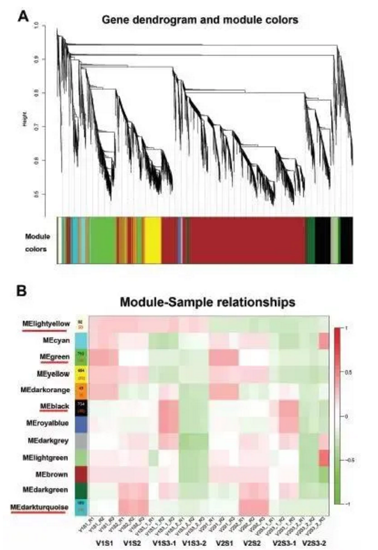 第二:WGCNA分析。這個(gè)分析主要是將基因模塊與表型數(shù)據(jù)或者表型樣本進(jìn)行關(guān)聯(lián),從而快速的鎖定一批候選基因。