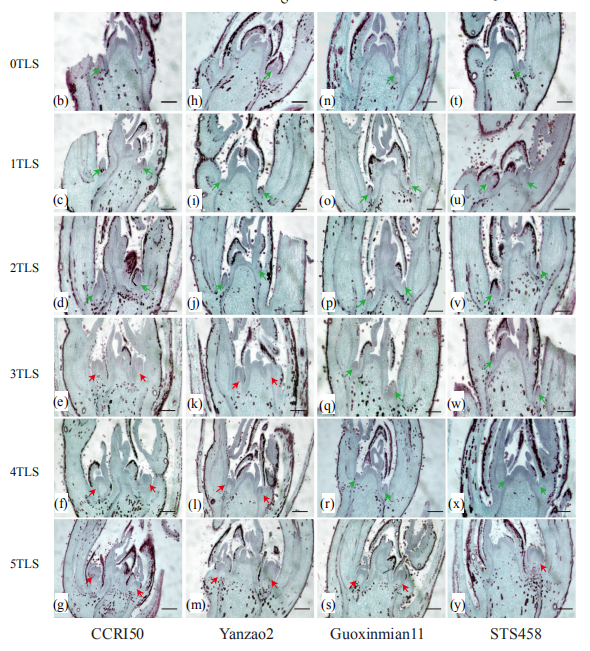 陸地棉(Gossypium hirsutum L.)是世界上最重要的纖維作物。在我國(guó)黃河流域和長(zhǎng)江流域棉區(qū),實(shí)現(xiàn)早熟棉在小麥或者油菜后直播可以提高復(fù)種指數(shù)。而在西北內(nèi)陸棉區(qū),春季氣溫低,秋季枯霜早,早熟棉既能提高棉花的霜前花率,還可以改善棉花品質(zhì)?;ㄑ糠只怯绊懚碳久奁贩N早熟的重要性狀,是棉花現(xiàn)蕾期、開(kāi)花期和成鈴期發(fā)育的基礎(chǔ),花芽分化直接影響開(kāi)花時(shí)間?;ㄑ糠只侵参飶臓I(yíng)養(yǎng)生長(zhǎng)向生殖生長(zhǎng)過(guò)渡的標(biāo)志。當(dāng)進(jìn)入生殖生長(zhǎng)時(shí),側(cè)芽變成花芽,花芽發(fā)育成果枝。果枝分化決定了開(kāi)花量、生殖能力和棉花產(chǎn)量。因此,早熟性狀及早熟棉品種在生產(chǎn)上顯得尤為重要。
