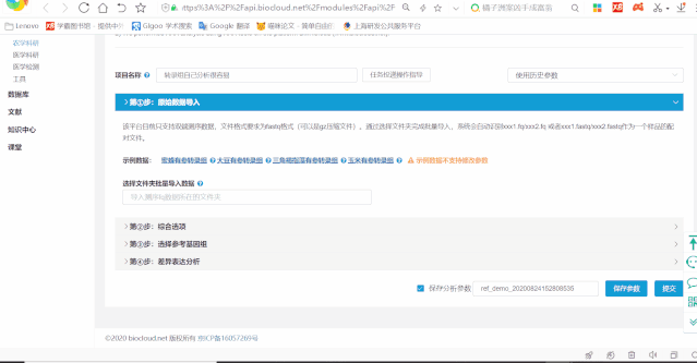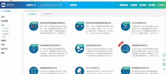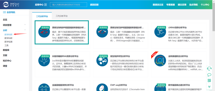 百邁客云包含農(nóng)學(xué)和醫(yī)學(xué)兩大類(lèi)分析平臺(tái),醫(yī)學(xué)分析平臺(tái)主要針對(duì)人、鼠數(shù)據(jù)的分析,包含:轉(zhuǎn)錄組、非編碼RNA、單基因病外顯子、腫瘤外顯子、重測(cè)序等數(shù)據(jù)分析,以及全轉(zhuǎn)錄組聯(lián)合分析;農(nóng)學(xué)分析平臺(tái)可以應(yīng)用到更多的物種,涵蓋轉(zhuǎn)錄組、非編碼RNA、微生物、蛋白、代謝等數(shù)據(jù)的分析,以及全轉(zhuǎn)錄組聯(lián)合分析等。點(diǎn)擊左側(cè)導(dǎo)航分析->農(nóng)學(xué)或者醫(yī)學(xué)打開(kāi)分析平臺(tái)列表頁(yè)面,點(diǎn)擊選擇您想要使用的分析平臺(tái),打開(kāi)其詳細(xì)介紹頁(yè)面,該頁(yè)面可以看到該平臺(tái)的應(yīng)用領(lǐng)域“平臺(tái)介紹“技術(shù)背景“案例“課堂“版本記錄,點(diǎn)擊打開(kāi)軟件即可進(jìn)入到參數(shù)頁(yè)面。