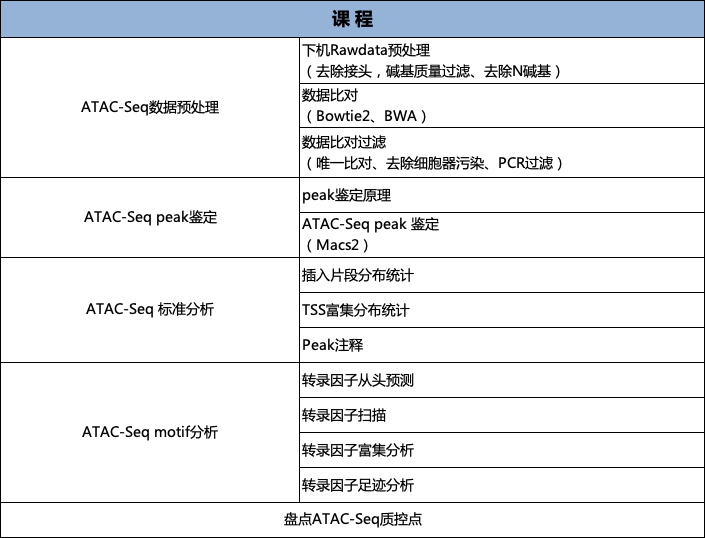 本課程主要從技術(shù)原理、實(shí)驗(yàn)步驟、生物信息學(xué)分析、文獻(xiàn)分享四大內(nèi)容向大家介紹ATAC-Seq技術(shù)。同時(shí),本課程還涉及專(zhuān)門(mén)的生物信息學(xué)實(shí)操課程,帶領(lǐng)大家學(xué)習(xí)ATAC-Seq基本分析流程,其中包括數(shù)據(jù)質(zhì)控、Peak Calling、Motif分析等。從而幫助大家將ATAC-Seq運(yùn)用在自己的課題當(dāng)中。